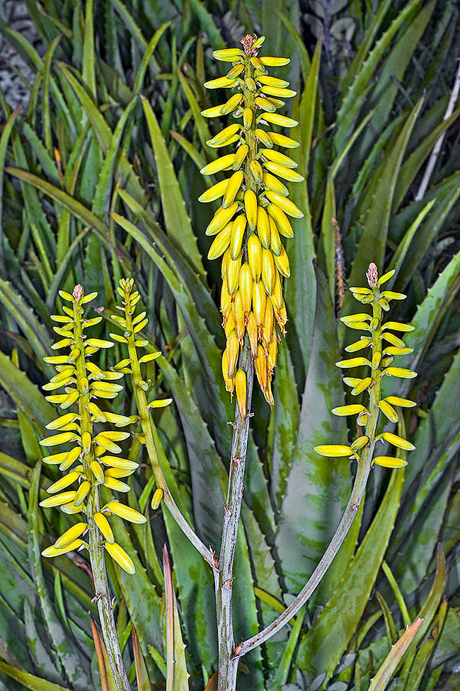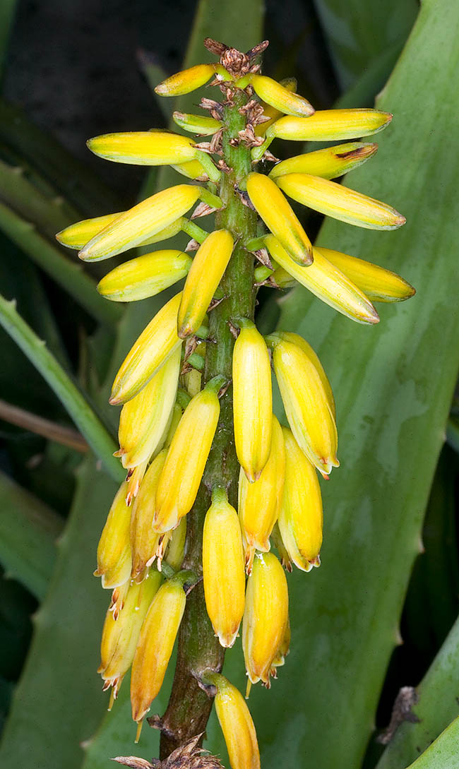 Lo stelo fiorifero, di norma ramificato, può elevarsi fino a 60-90 cm sopra le foglie. I fiori, organizzati in racemi, sono penduli, lunghi 2-3 cm, costituiti da sei tepali saldati in una struttura tubulare (perigonio) di colore giallo brillante. I fiori rossi si possono trovare nelle varietà coltivate. L’ovario è supero. Gli stami e lo stigma, a maturità, sporgono leggermente il perigonio. La maturazione del polline avviene prima della recettività dello stigma (fiori proterandri), ciò impedisce l’autoimpollinazione, pertanto, sono necessari i pronubi che, nei luoghi di origine, sono uccelli con il lungo becco che si nutrono di nettare, noti come nettarinie (Nectariniidae). Talora i fiori possono essere impollinati dagli insetti. Negli Stati Uniti l’impollinazione è operata da uccelli con il becco lungo come i colibrì. Lo stato di maturazione dei fiori è graduale e va dal basso verso l’alto.