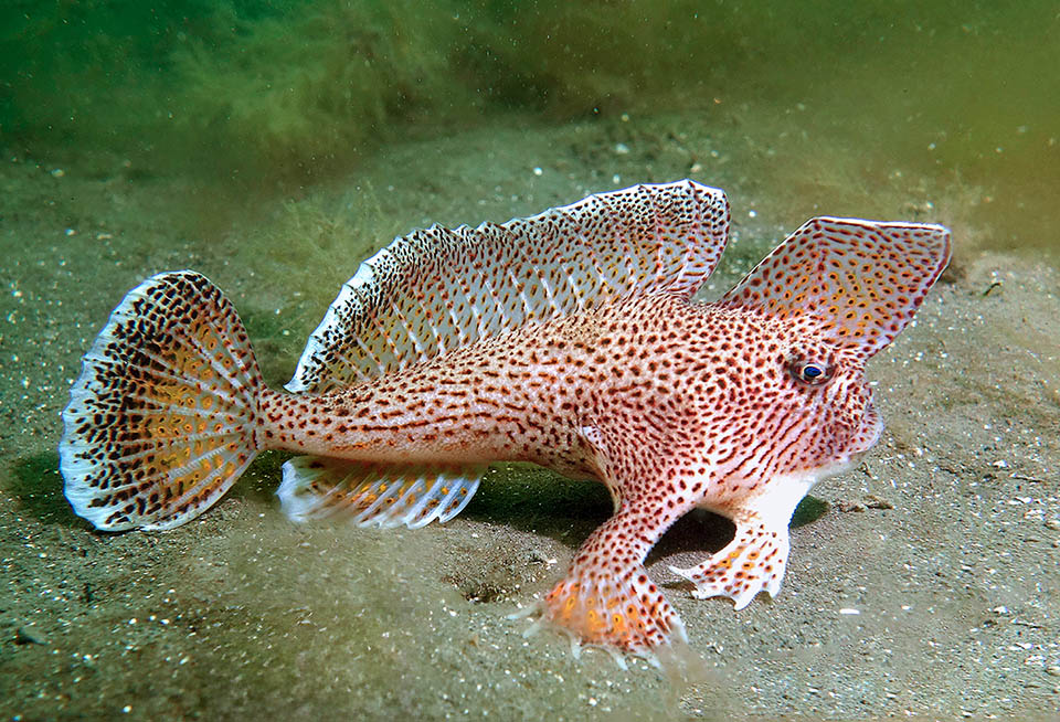 15 cm long at most, has the pectoral fins transformed in arms with a sort of a hand with 7 fingers for moving and digging on seabeds, usually between 5 and 15 m of depth © John Turnbull