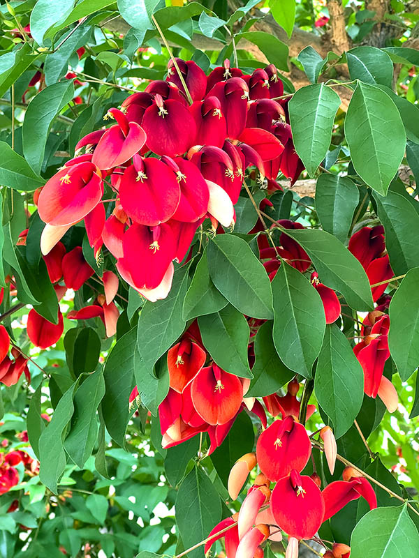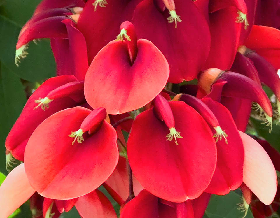 Ha foglie composte trifogliate e fiori, rosso corallo, in vistosi racemi terminali lunghi fino a 25-30 cm. Calice persistente e corolla papilionacea con ampio vessillo cuoriforme © Giuseppe Mazza