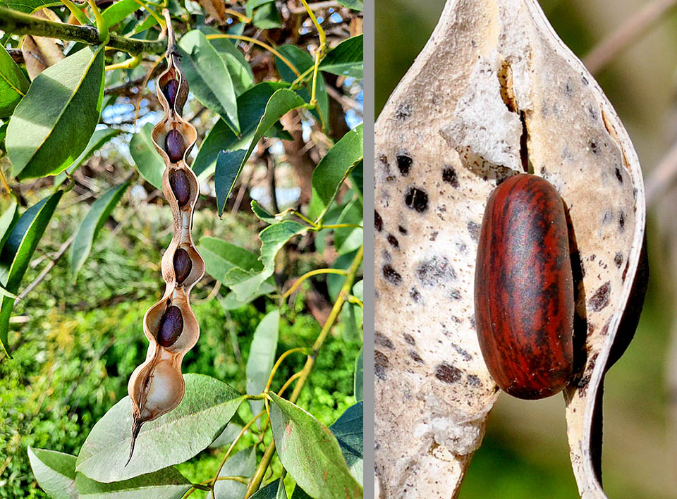 I frutti sono legumi nerastri che al loro interno racchiudono i semi color rosso-marrone.