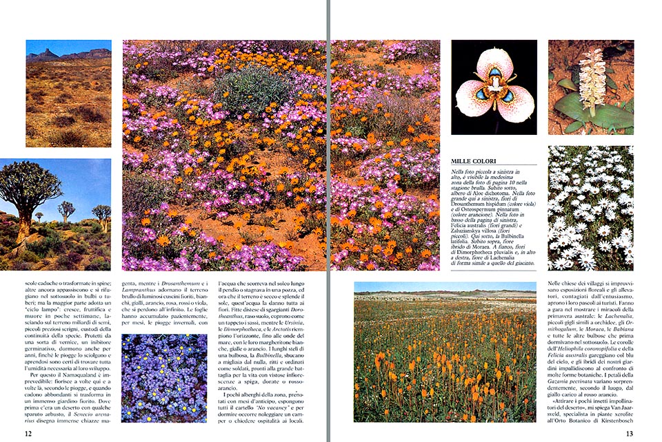 Migliaia di “cuscini” fioriti, bianchi, gialli, arancio, rosa, rossi e viola si perdono all’infinito. Le foglie hanno accumulato pazientemente, per mesi, le piogge invernali, l’acqua che scorreva nel solco lungo il pendio o stagnava in una pozza, ed ora che il terreno è secco e splende il sole, la danno tutta ai fiori. Distese di Dorotheanthus, di margheritone bianche, gialle e arancioni (Ursinia, Dimorphotheca, Arctotis, Osteospermum e Gorteria) riempiono lo sguardo fino all’orizzonte, mentre i lunghi steli delle Bulbinella sbucano a migliaia dal nulla.