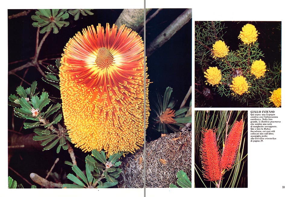Alcune Grevillea ed Isopogon, la Dryandra formosa e la Petrophile media si accontentano di raggruppare meno fiori, ma allora le corolle si fanno piu grandi, e le infiorescenze emisferiche o quasi piatte.